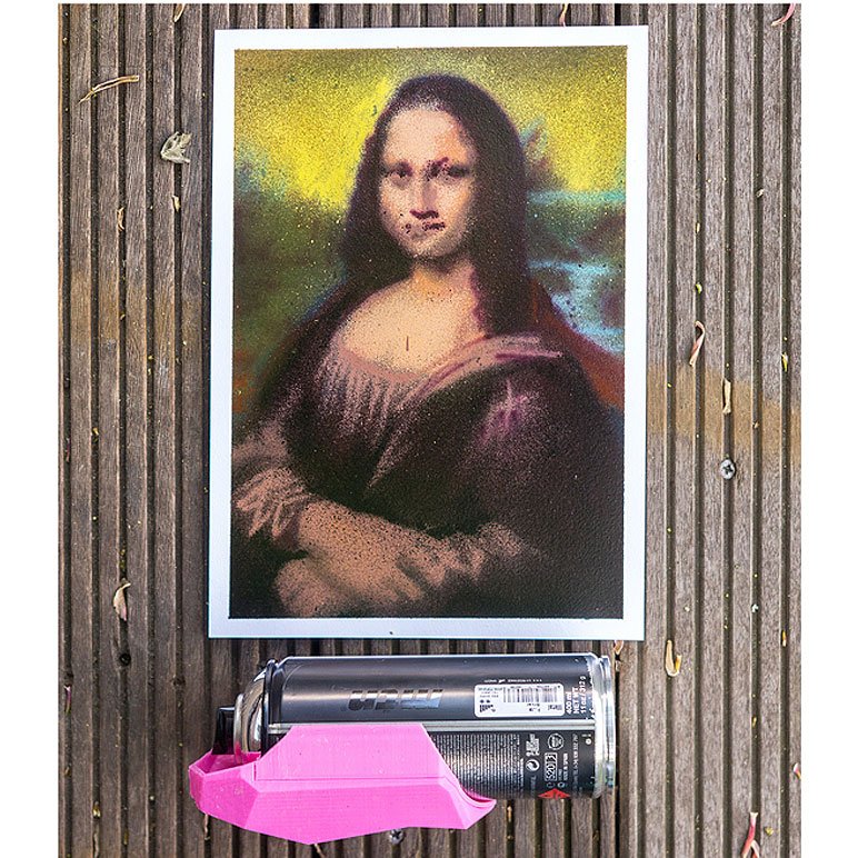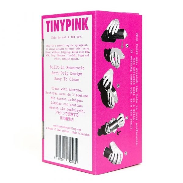 «The Tinypink is a professional stencil cap which, once attached to the spray can, allows for ultra-fine lines. The spray jet, of just a few millimeters, is much more precise than with any other cap. It is the essential accessory for creating tiny details or for working in very small formats, on canvas for example. The Tinypink Stencil cap differs from the traditional Stencil cap by its paint recovery system. The excess paint no longer flows on the sprayer (and on the hands) or on the floor, the workspace is now clean. It is collected in a dedicated tank and can be reused thanks to the removable cap located at the bottom of the tank. No more waste of paint, the excess can be recycled in a marker or used with a brush for example.»