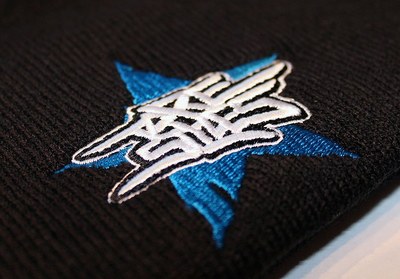 Black beanie with white-black-blue logo on front, and stitched silk label on back.