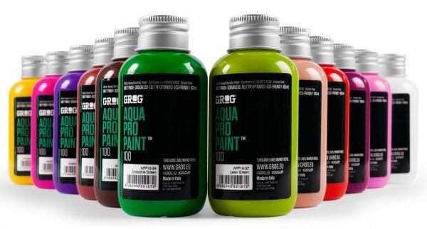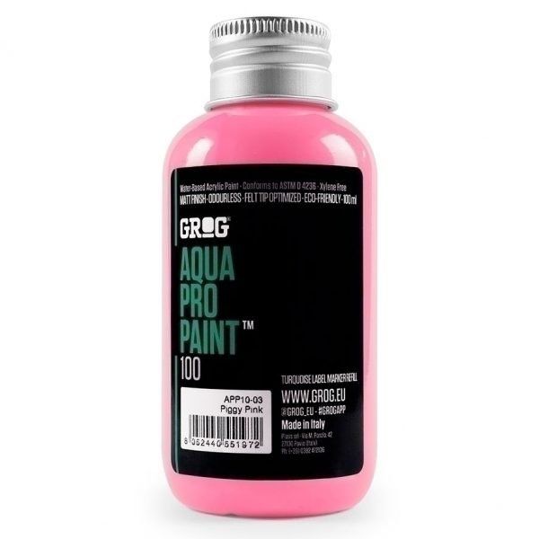 AQUA PRO PAINT 100 is synonym of multi-functionality. Supplied in a shockproof plastic bottle, is born to refill our GROG Turquoise Label markers. 100 ml of a water-based highly pigmented acrylic paint, optimized for POINTER, CUTTER and SQUEEZER markers, AQUA PRO PAINT 100 can be used with brushes or airbrush too. If you are looking for a weather resistant, permanent, super opaque and deep matt finish formula, this is for you. Ideal for both porous and non-porous materials, works like a charm on dark surfaces.»