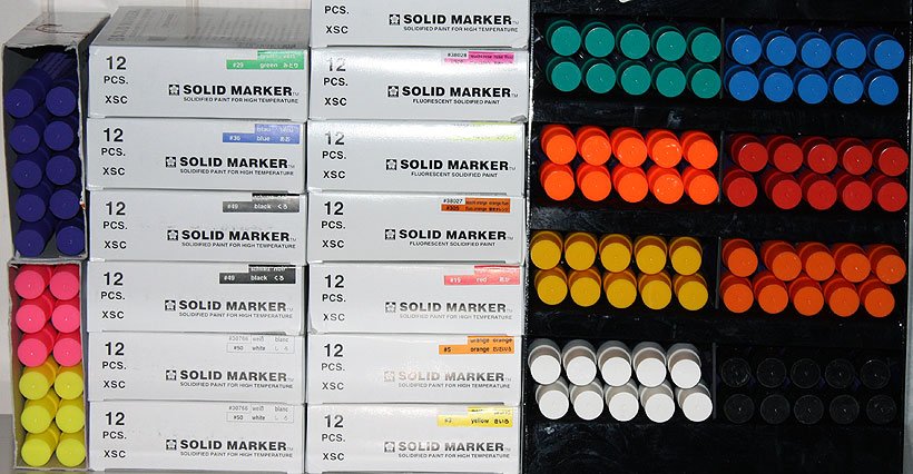 «For big tough jobs, choose the popular Solid Marker. It marks through oil, grease, rust, mud, snow – inside or outside. It is absolutely permanent. Solid markers won’t fade or wash off like chalk. The special «stay fresh» twist top keeps paint fresh and ready to use.»